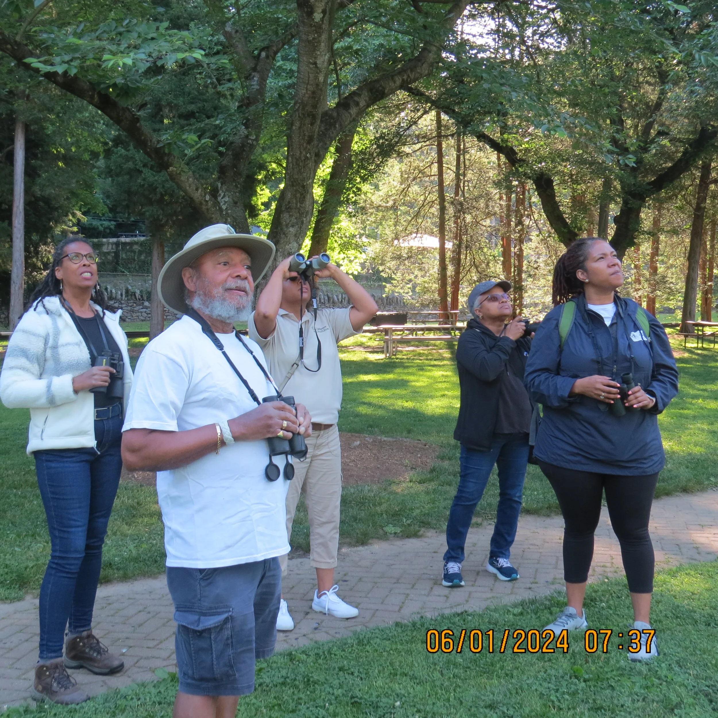 Scanning for birds at Brandywine Park in Wilmington at the 2024 Black Birders Week event.