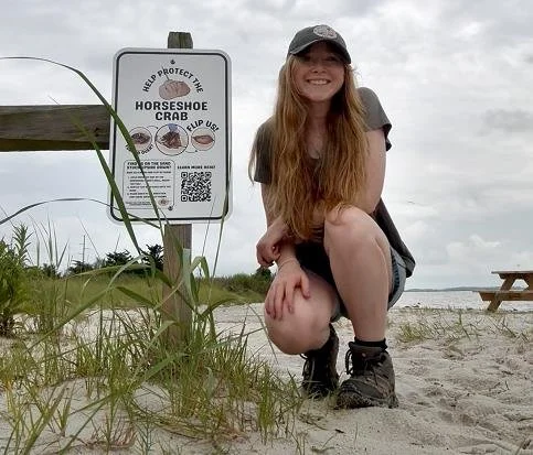 As part of Delaware Audubon's 2025 Conservation Grant program, signs showing how to help stranded horseshoe crabs can now be seen in the vicinity of Delaware's inland bays. Sofia Rose Trone, an undergraduate at Purdue University, applied for the grant, designed the signs, and delivered them to her contacts in Sussex County. Nine signs were installed in six locations by DNREC and the Delaware Center for the Inland Bays along the coastline of Rehoboth Bay.